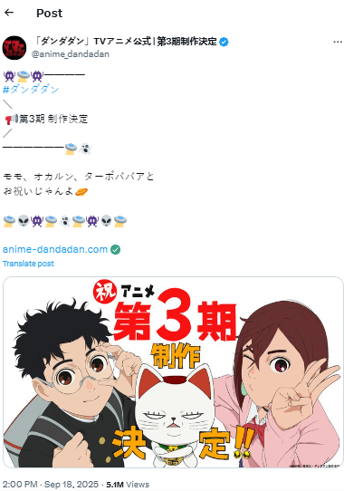 Sem revelar datas, o estúdio soltou apenas que a terceira temporada de DanDaDan deve começar imediatamente após os eventos vistos no episódio final recente, quando o Robô Buda Gigante derrotou o kaiju. A imagem promocional traz Momo e Okarun em pose de combate, sugerindo que a nova ameaça já está a caminho.